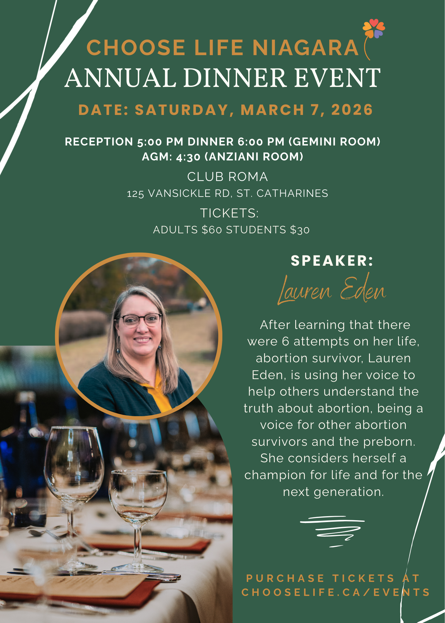 Choose Life Niagara Annual Dinner Saturday, March 7, 2026 5:00 PM 9:30 PM 17:00 21:30 Club Roma 125 Vansickle Road St. Catharines, ON, L2S 3W4 Canada (map) Google Calendar ICS REGISTRATION IS NOW OPEN! BUY TICKETS Join us at out 2026 Annual Dinner as we mark our 45th year as a registered charity, promoting respect for life from conception to natural death throughout Niagara and beyond. BUY TICKETS